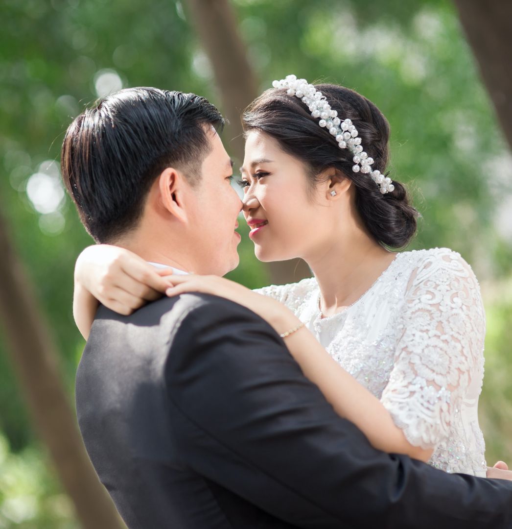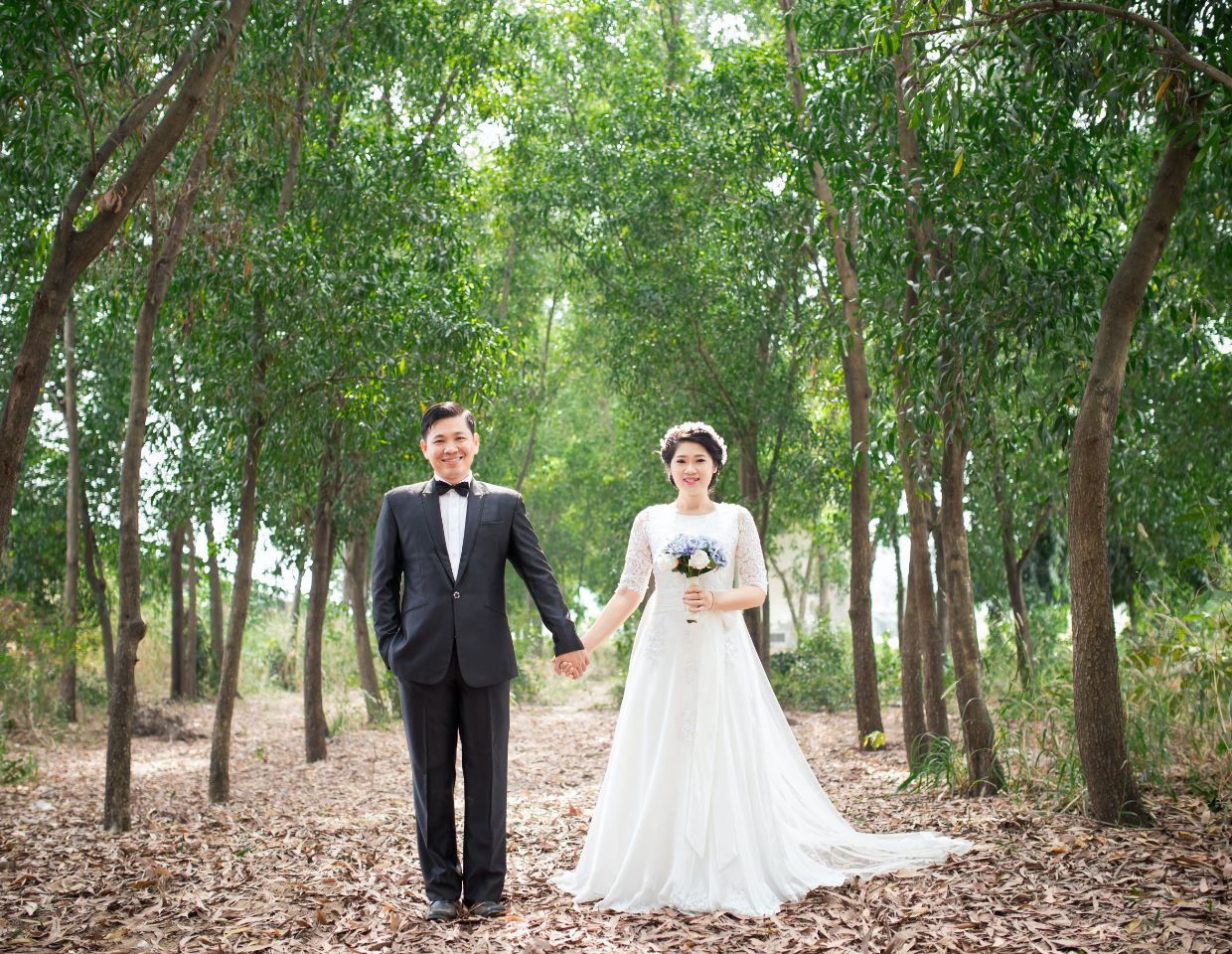 In this wedding photo session, the beauty of mother nature is the best background for such an amazing couple. Take a look at how harmonic looks in the white wedding dress on these green trees’ background.